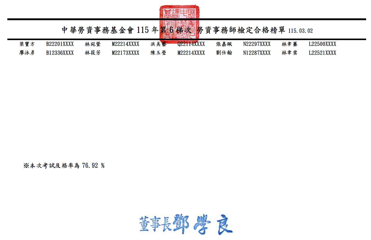 115年度第6梯次 勞資事務師檢定格榜單 放榜日期:115年03月05日
