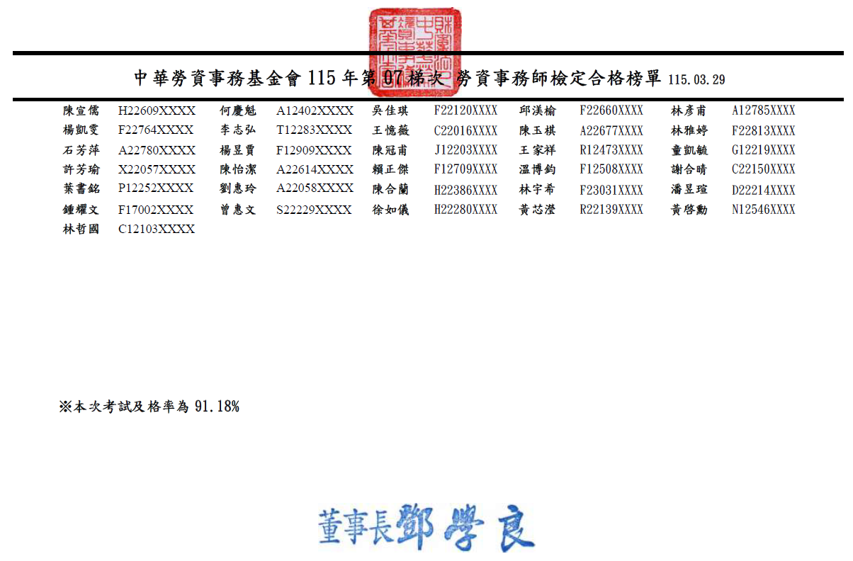 115年度第7梯次 勞資事務師檢定合格榜單 放榜日期:115年04月01日